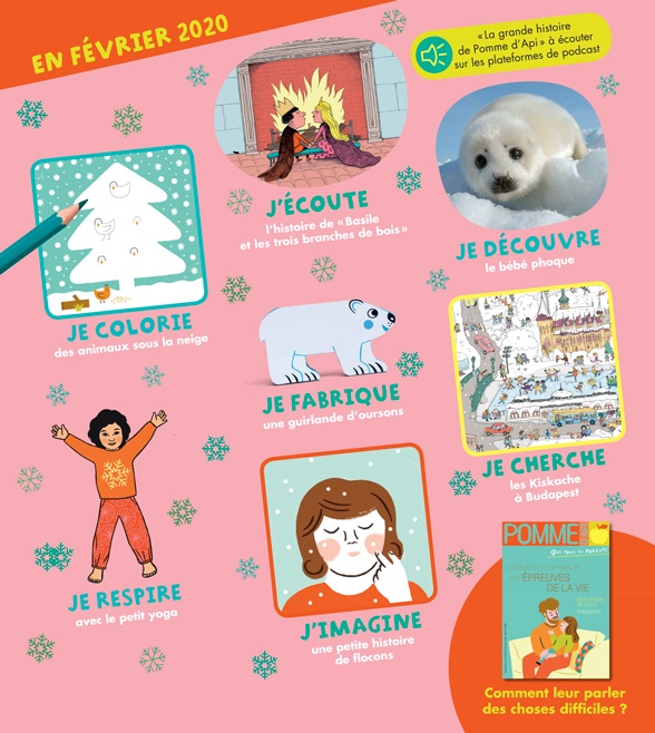 Un tapis blanc et moelleux a recouvert Pomme d’Api ! Milie et Georges s’en donnent à cœur joie dans le jardin, Petit Ours Brun se lance sur la piste de la patinoire, des flocons tombent sur le roi cruel de la grande histoire… Un nouveau numéro à découvrir installés bien au chaud !